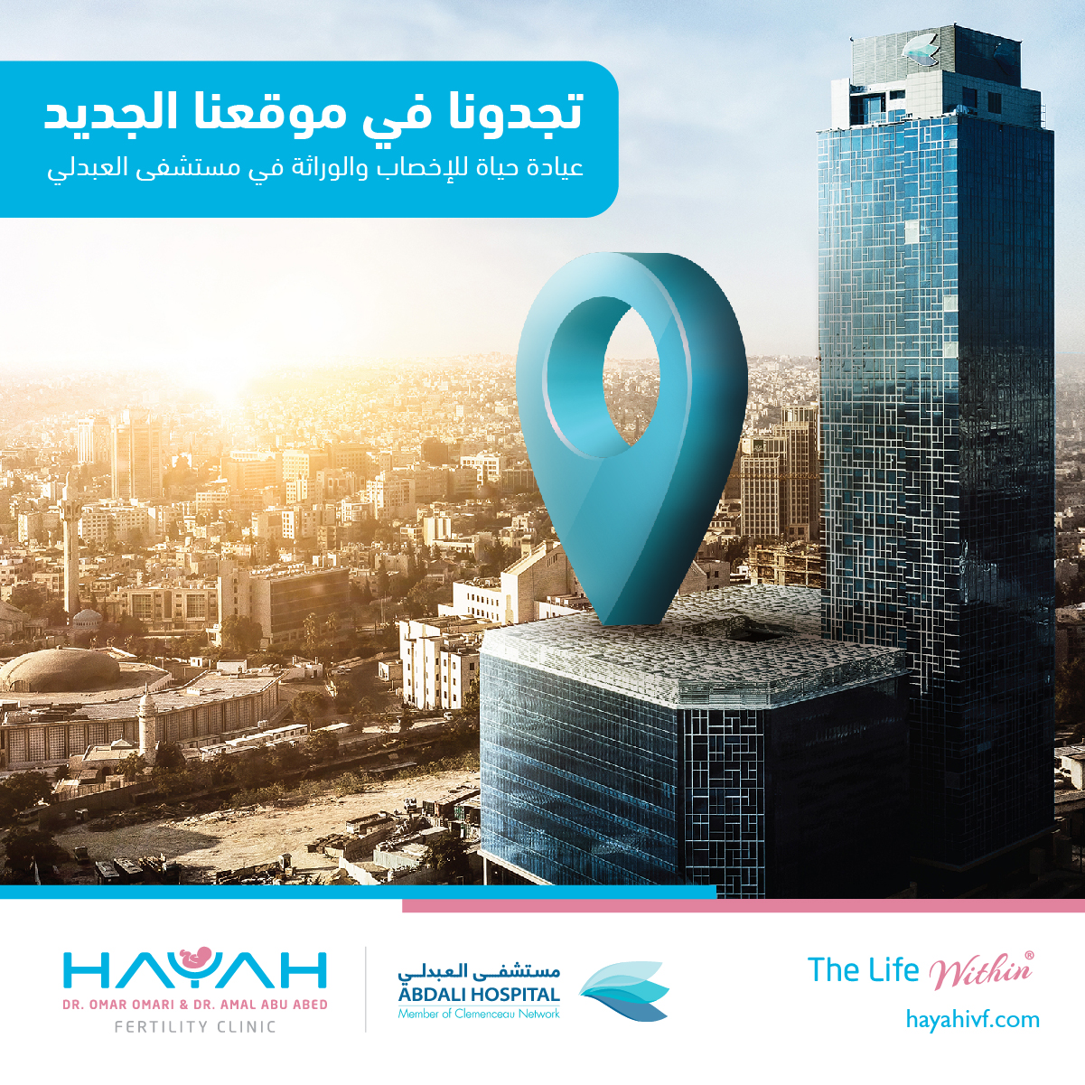 تعلن أسرة مركز حياه للإخصاب والوراثة عن انتقال مقر المركز إلى موقعه الجديد في مستشفى العبدلي الطابق 24 وذلك لمواكبة مسيرة المركز المستمرة في التوسع ونمو خدماته الطبية في مجالات الإخصاب والوراثة، ومعالجة العقم وتأخر الإنجاب، ورعاية الحمل والولادة، والعمليات النسائية المتقدمة.